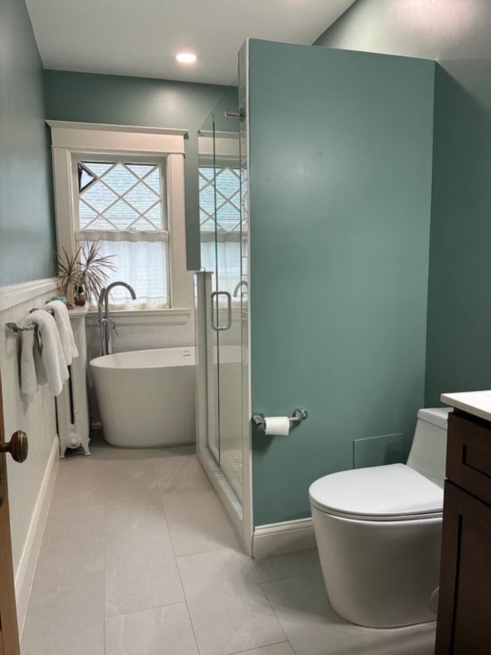 Updated Bathroom — Clean and bright with white ceramic tile, a full tub/shower combo, modern fixtures, and a stylish glass block window for privacy and diffused natural light. $900/month, available immediately, 6 month minimum lease.
