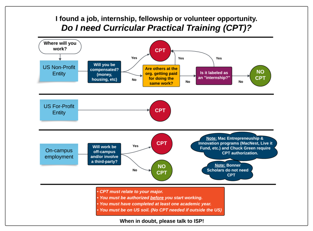 - One year of full-time CPT eliminates a student’s eligibility for OPT (which generally will not happen to Macalester international students).