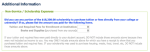 - On the section “Additional Information”, on the page Non-Service / Scholarship Expenses in GLACIER Tax Prep (GTP), example below: