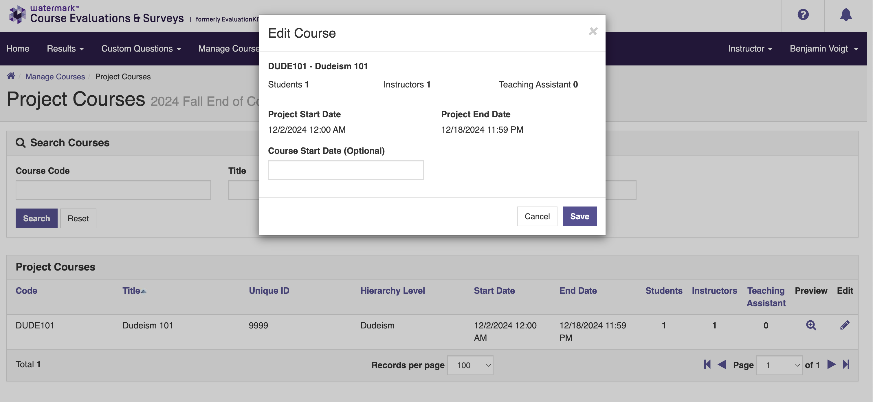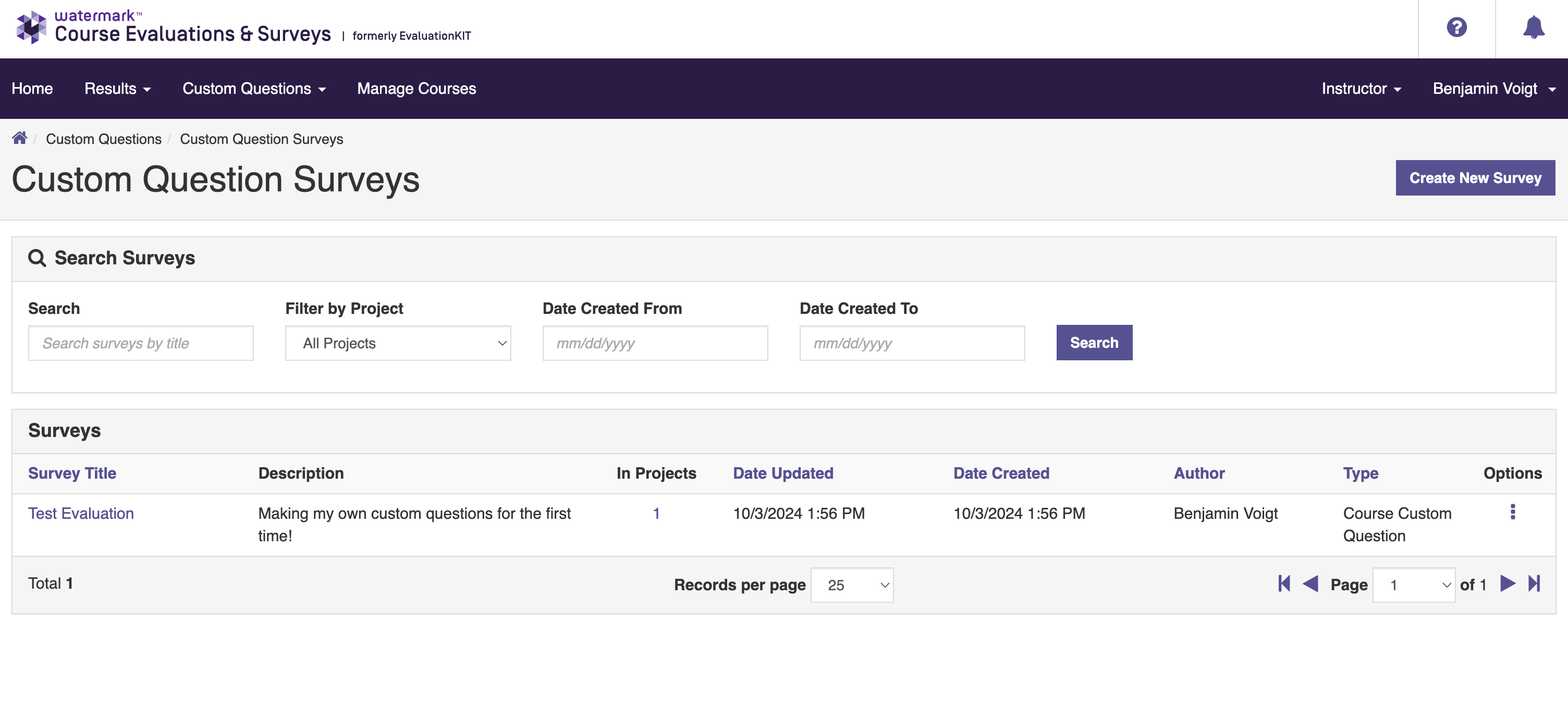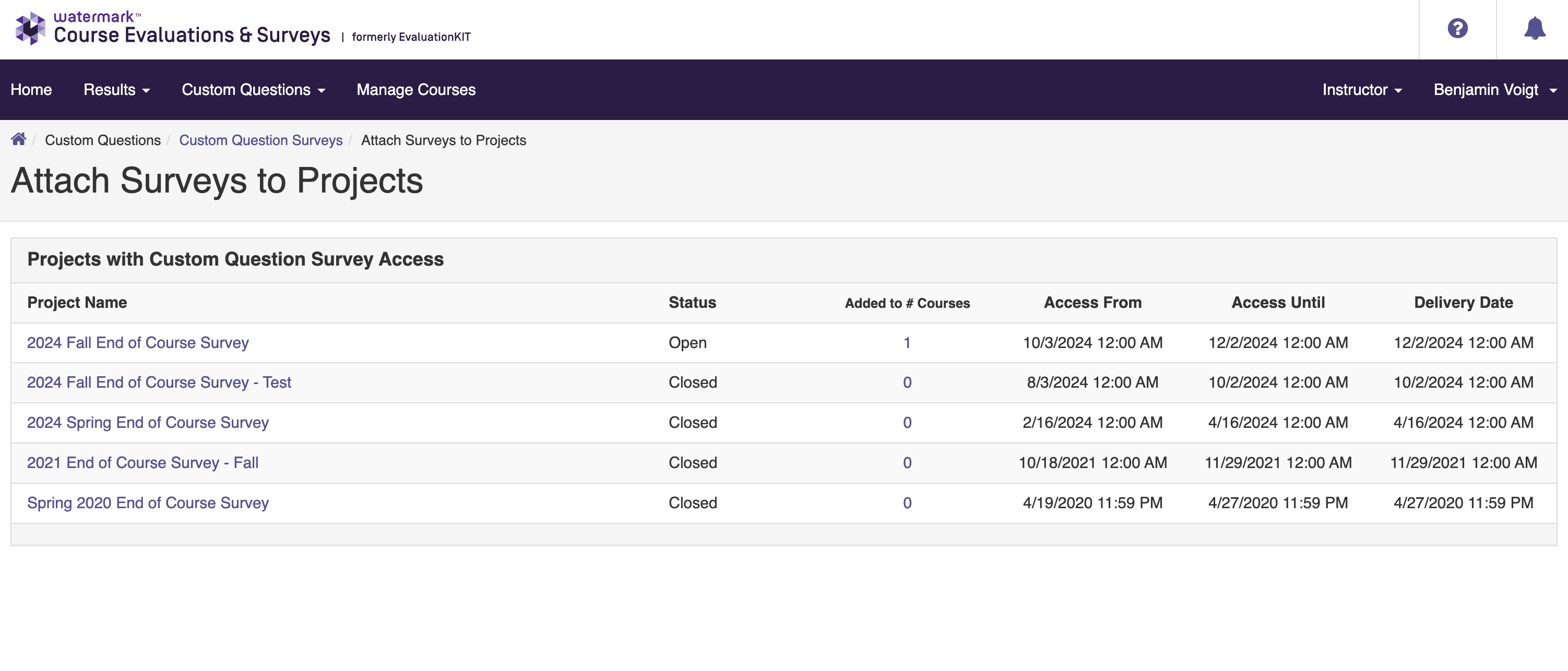By default, course evaluations use Watermark’s tool Evalkit for end-of-course surveys. Faculty can choose to use Evalkit and the default survey questions, add their own custom questions, modify their survey’s availability window, or opt out of using Evalkit.