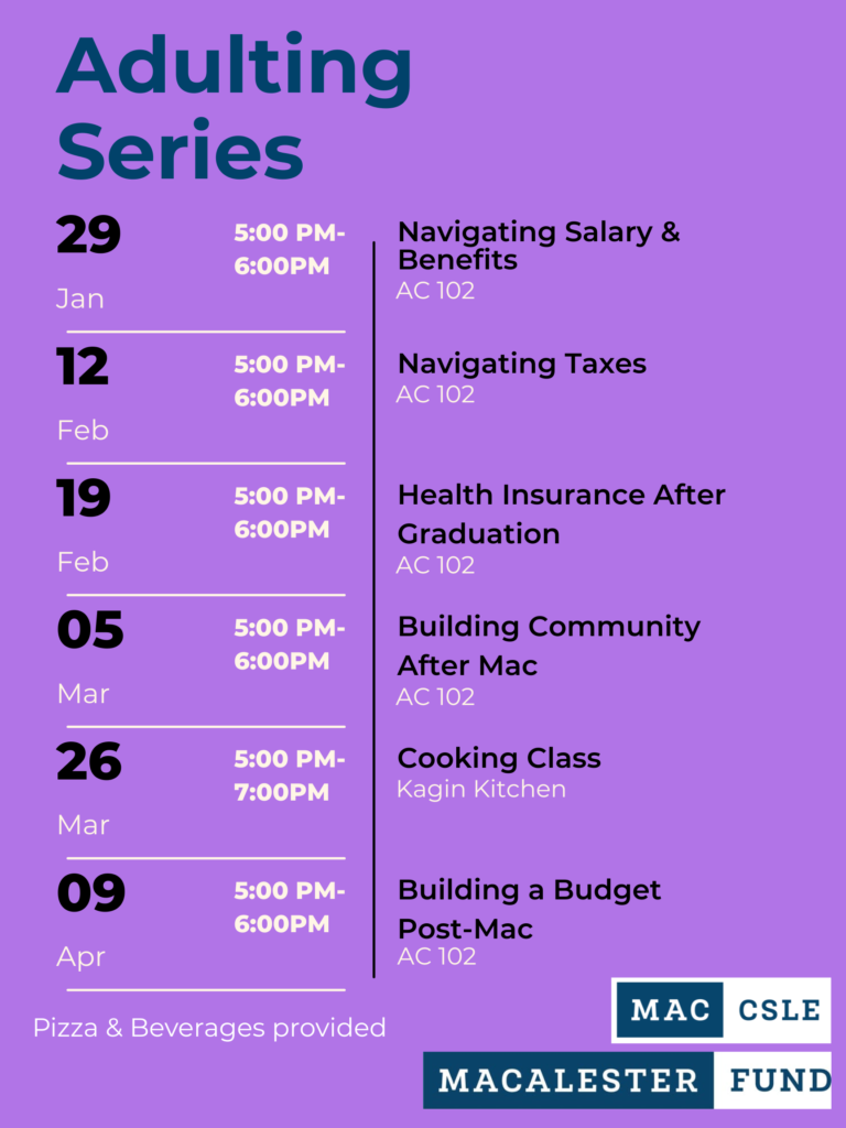 Adulting is a program designed to support Mac students with events, resources and insights as they move through their Mac experience and approach graduation – such as finding a place to live, how to manage a budget, how to make friends after college, and more. The resources you will find at the links below were created and compiled by Macalester alumni, staff, and faculty with Mac students in mind. Please contact Andy Williams ([email protected]) with questions, suggestions or feedback.
