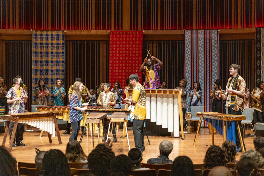 The Macalester African Music Ensemble, founded in 1987 and directed by Sowah Mensah, performs traditional African music primarily from Ghana, but also from Nigeria, Zimbabwe, Guinea, The Gambia, Kenya, and Tanzania. In addition to singing, the Ensemble performs with a variety of African instruments including xylophones, marimbas, flutes, horns, an assortment of drums and gourds. The 40-member ensemble is open to all members of the Macalester College community. Auditions are held once a year in September; no prior experience in African music is required.