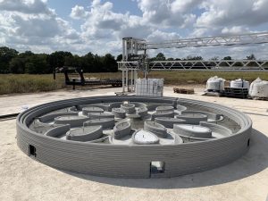 The conceptual design would be printed with a lunar regolith-based concrete. Regolith is like dirt…and there are a lot of different ideas about how you could turn that into concrete. Right now, we are printing the prototype with an Earth-based concrete developed by the company doing the printing for us.