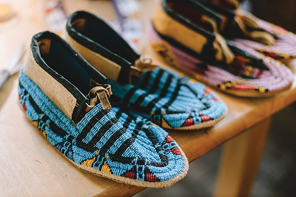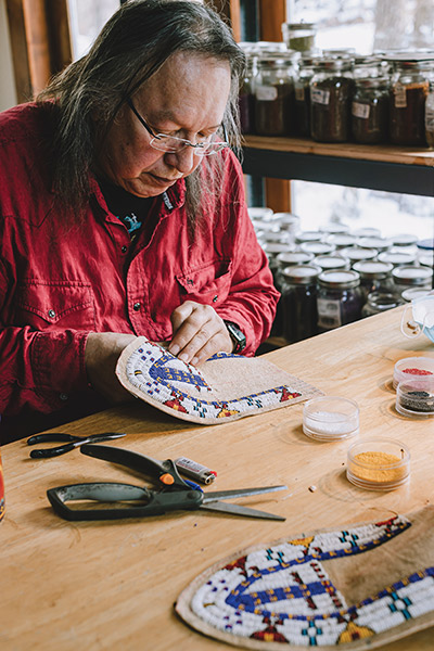 These days LaBatte works in his garage studio in Granite Falls, making moccasins with meticulous attention to detail. His favorite compliment, he says, was from a customer who said, “Your moccasins look like what I see in museums.” While he entered a few art shows when he first started out—winning first place at a Rapid City, S.D., art exhibition—LaBatte discovered that posting his work on Facebook generated all the commissions he could handle. When a friend showed a pair of his moccasins during an interview on a national television news program, demand for his work skyrocketed. His growing reputation received another boost in 2016, when he received a request for moccasins from presidential candidate Bernie Sanders.