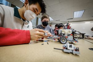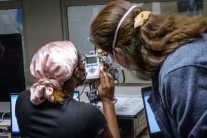 Students work in teams both in class and out of it. During the first few weeks of the class, I assign teams for in-class work, encouraging students to get to know a number of their classmates. We also spend most of each class day working on activities in class with our robots; so what each team is doing is very visible to others. I encourage students to chat informally with other teams and help each other out.