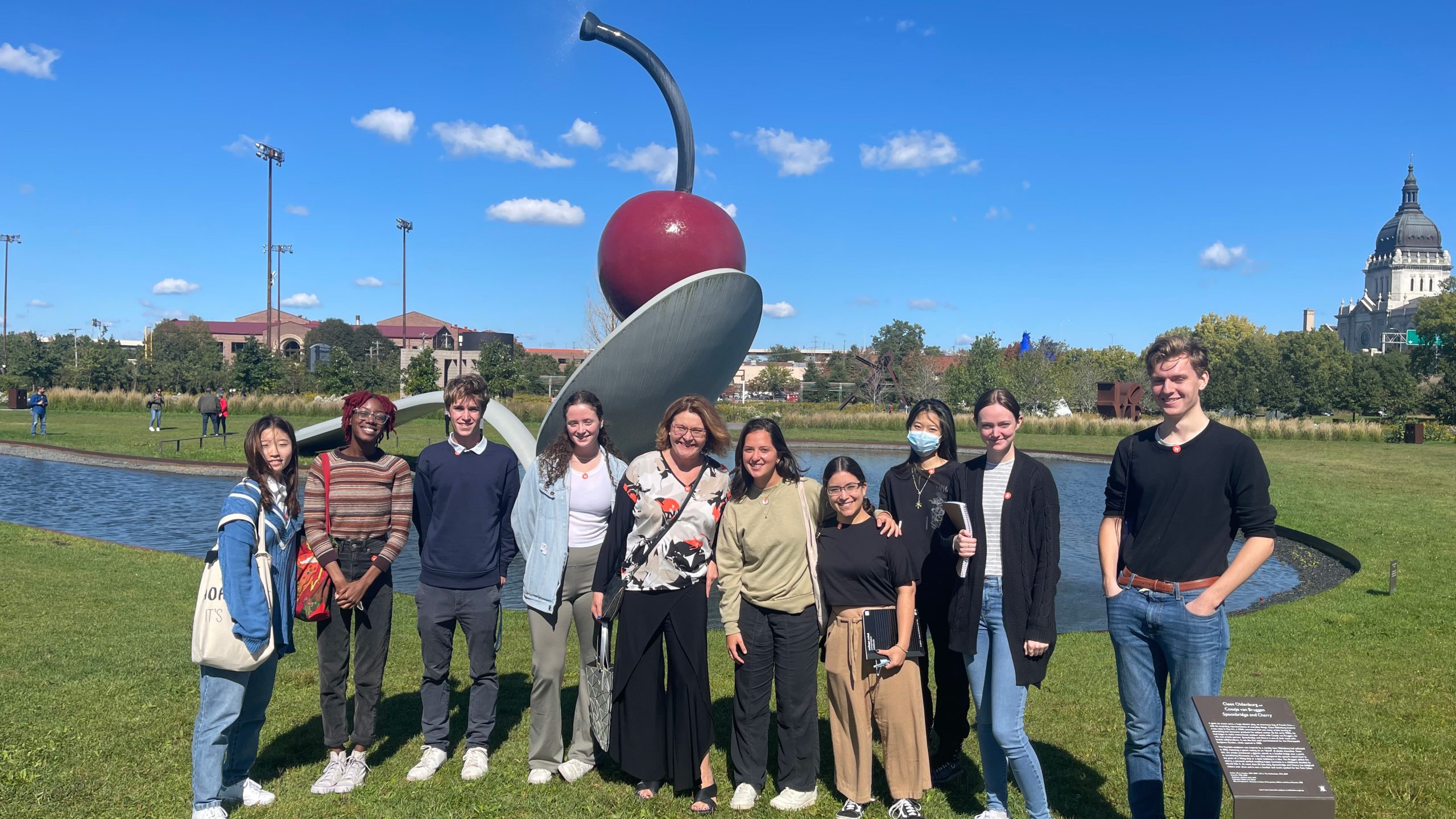 Students ventured to the Minneapolis Sculpture Garden and stood next to the iconic “Spoonbridge and Cherry” sculpture—part of “a tradition of visible pop art in Minneapolis,” says Professor Joanna Inglot.