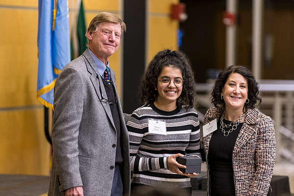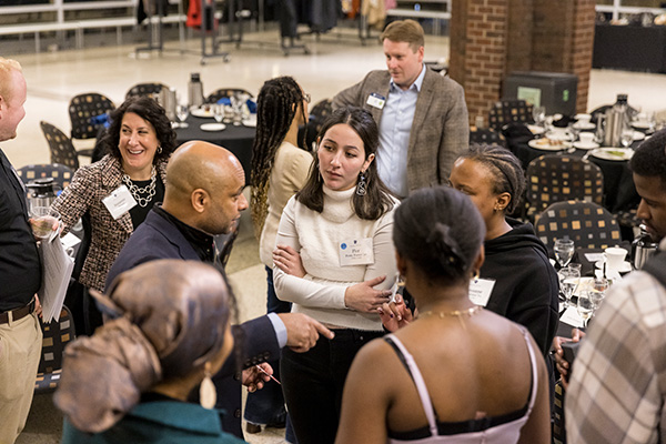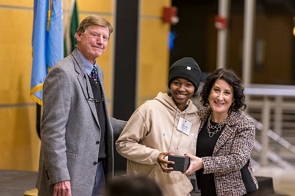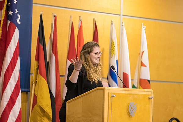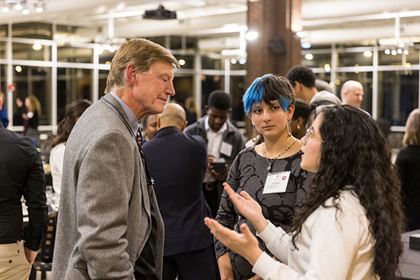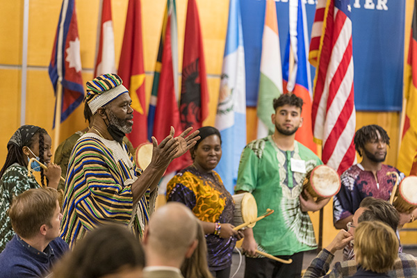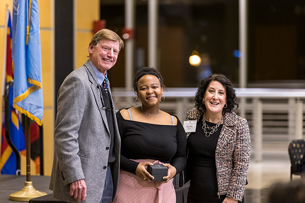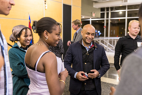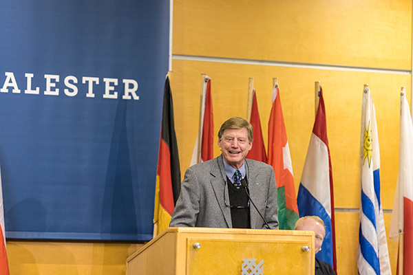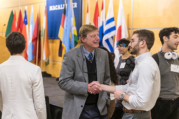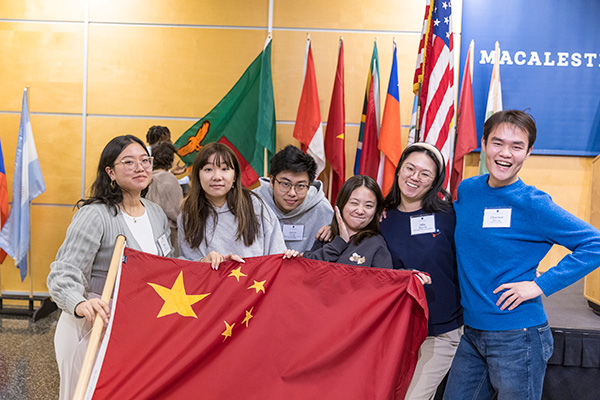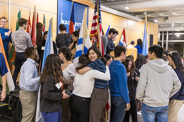 On December 6, Macalester’s Davis United World College Scholars gathered to welcome and celebrate its newest cohort. Each of the thirty-four first-year students—representing twenty-two countries and fourteen institutions—received a crystal globe as part of the annual dinner. This year’s dinner included special guests Davis UWC Scholars Program executive director Phil Geier; Davis director of partnerships and innovation Jacob Mnookin; and Tonderai Chikuhwa ’96, UWC alumnus and chief of staff and senior policy advisor in the United Nations’ Office of the Special Representative of the Secretary-General on Sexual Violence in Conflict. Among the ninety-nine higher education institutions partnering with the world’s largest international undergraduate scholarship program, last year only six had more Davis UWC Scholars on campus than Macalester, with a total of 110.