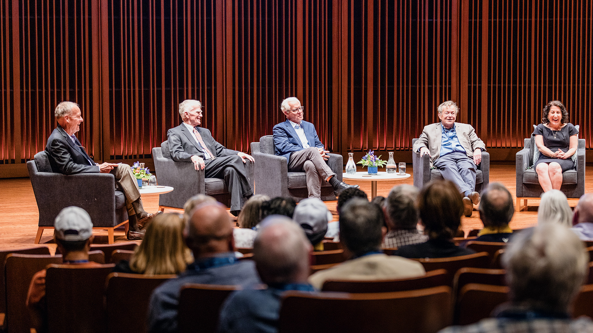 A chemist, an economist, a Dickens scholar, and a bioethicist gathered on the Mairs Concert Hall stage at Reunion 2024. As part of the college’s sesquicentennial celebration, Presidents Emeriti Robert M. Gavin Jr., Michael S. McPherson, and Brian C. Rosenberg joined President Suzanne M. Rivera to discuss their tenures at Macalester, guided by moderator and Trustee Emeritus Jeff Larson ’79. Here, we share edited excerpts of their wide-ranging conversation about some of the joys and challenges of leading a liberal arts college.