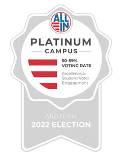 Macalester was recognized by the ALL IN Campus Democracy Challenge for nonpartisan democratic engagement efforts that fostered high levels of student voter engagement in the 2022 midterm elections. Macalester made ALL IN’s inaugural “Top Campuses by Voter Turnout” list for four-year private institutions and earned a platinum seal for a voting rate of 50-59%, based on the National Study of Learning, Voting, and Engagement report from Tufts University.
