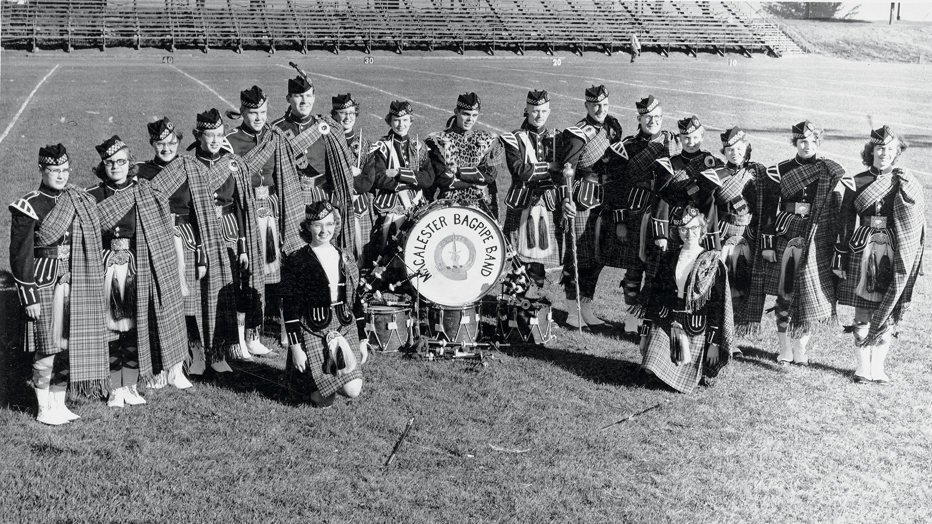 The first reference to bagpipes as an instrument of school spirit appeared in a January 1938 letter to the student forum section of the Mac Weekly. The writer called on their fellow students to “show our athletic opponents that Macites have as much pep as the best of them” by adopting a few “Scotch yells” and dressing their “bonnie rooter kings in plaid kilts,” even suggesting—perhaps tongue only lightly in cheek—that bagpipes could be added to the pep band.