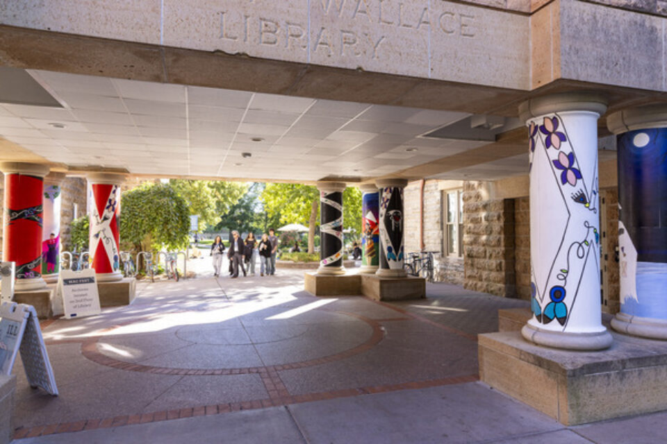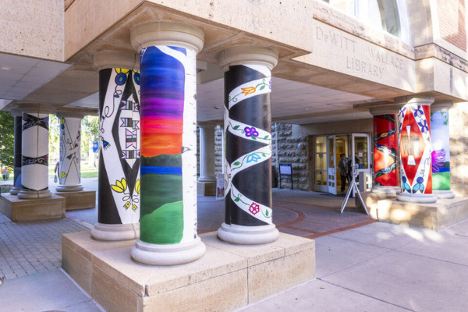 On a sunny Saturday in October, Minneapolis artist Natchez Beaulieu and her team are installing the final panels of a new campus mural outside the DeWitt Wallace Library, part of the college’s ongoing work to honor Minnesota’s Indigenous land, water, and communities. With Mac Fest celebrations happening all over campus, the walkway is bustling. Early in the afternoon, Beaulieu pauses to wash glue off her hands and lead a Mac Fest program about the project in a full Harmon Room. An hour later, she’s back to work—with frequent breaks to talk with passersby who stop to ask questions, watch the process, and admire the pillars.