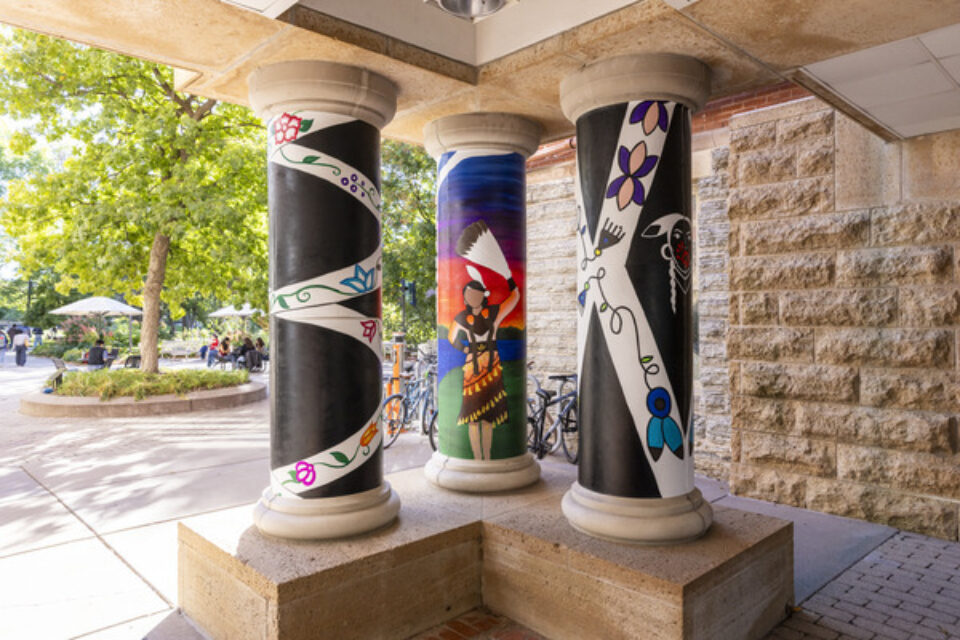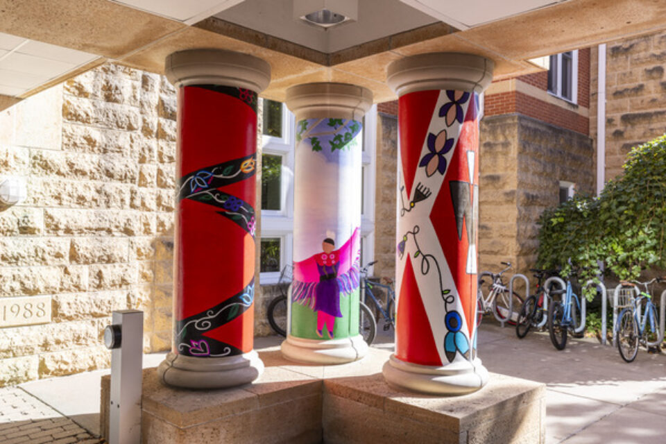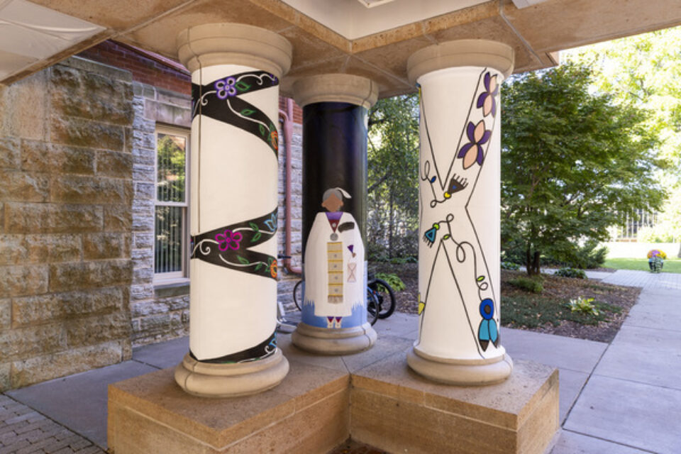 Beaulieu’s mural work uses an indirect fabrication method with polytab, which becomes a canvas that’s paintable, portable, and designed to withstand Minnesota winters. This fall, her team adhered the panels to the twelve pillars under the Link in the heart of campus—an intentionally chosen location, designed to spur learning, reflection, and meaningful action.
