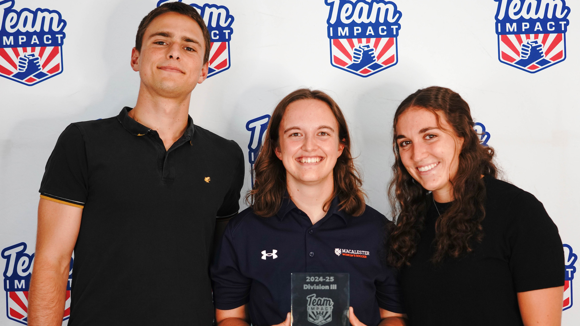 Macalester students Theo Darci-Maher ’27, Sarah Solomon ’26, and Mary Daley ’27, all Team Impact Fellows, earned the 2025 Division III Team Impact Fellowship Campus of the Year award.