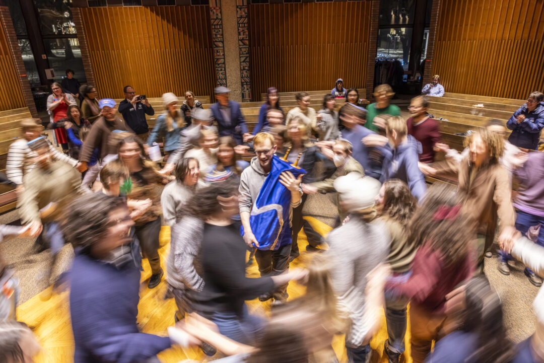 That distinct spirit of togetherness could be felt throughout the Hachnashat Sefer Torah—a scroll welcoming celebration—on February 22, 2026. And it was felt across the generations as Macalester alums and friends of all ages returned to campus to dance, chant, and celebrate alongside current students, staff, and faculty.