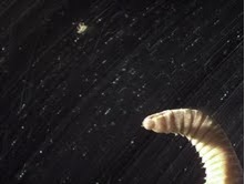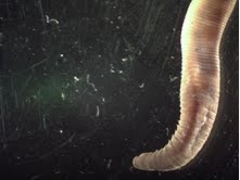 Another noticeable external feature of worms are the small hair-like structures, called setae or bristles, which are located on each segment. These can be extended or retracted and act as the principal function for movement 1. Setae are visible in Figures 1 and 3. Other essential features of worm anatomy are the various skin glands that secrete lubricating mucus, which aids movement through the earth and helps to stabilize burrows and casts 1. This is not visible in any of the Figures because the specimen was preserved in ethanol before photographing, but when it was collected it was actively secreting mucus and covered in the lubricating substance. Worms can range from a few millimeters long nearly a meter, but most common species are a 10-20 cm long 1.
