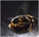 To differentiate between common species of Dineutus in the Midwest, color patterns and the morphology of the elytra and anterior legs are examined2. In this case, the specimen obtained is most likely Dineutus hornii because of the distinct reddish-brown color of its epipleura (the bent under portion of the elytra), and because its body length is 10.5mm long which is between the length range of 9.5-11mm for the species. The specimen is black with a dorsal bronzy sheen, and its ventral side is dark reddish-brown. Its legs are brownish-yellow1. Although Dineutus discolor is also reddish-brown on its ventral surface, it is only found in running water, and the specimen collected was found in a stagnant pond2. Dineutus americanus can be ruled out because the adult body length of the species is 8.0-9.0 mm, which is too small to be the specimen found. Neither can the specimen be Dineutus carolinus, which has a much rounder, less elongate body shape. The specimen found is most similar to the Dineutus species, Dineutus nigrior, because both species are oval, shiny black on their dorsal side, with brownish elytra, and brownish yellow legs. However, Dineutus nigrior is black ventrally, whereas Dineutus hornii is a dark reddish brown on its ventral surface1. Also, another source indicates that the specimen is slightly too small to be Dineutus nigriori because males and females of the species range from 10.8-12.1mm, and the species that was found is 10.5mm long2.