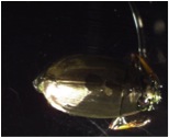 Adult whirligig beetles are usually seen on the surface. The adult beetles are able to float on top of the water because air is taken in under the elytra near the tip of the abdomen and is stored in a dorsal reservoir for buoyancy, and they have a water repellent body surface (which can be seen in the top right photograph above) and a set of bristles around the head and antenna, both of which aid in maintaining the beetle above the water. However, they are also able to go below the surface as long as they are rapidly swimming or grasping underwater vegetation2. Whirligig beetles are able to stay underwater for extended periods of time because they have abdominal spiracles within their dorsal reservoir which allow them to store air. Because water beetles swim both above and below the water’s surface, they have compound eyes which appear to be two pairs of eyes—one to see below the surface of the water and one to see above it2.