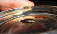 This specimen, collected at Katherine Ordway Natural History Study Area, belongs to Dineutus because of its size, 10.5mm, which is in the length range of this genus (9-15mm) and places it within the category of the large whirligig beetles. This, along with a concealed scutellum (posterior portion of the thorax), distinguishes it from the small whirligig beetles of genus Gyrinus, which are typically only 5-7mm long and have an obvious scutellum. Dineutus beetles are also characterized by their broad oval shape, and black color which can be either dull or shiny or have a bronze tint. Also, nine indented lines are found on the elytra5.