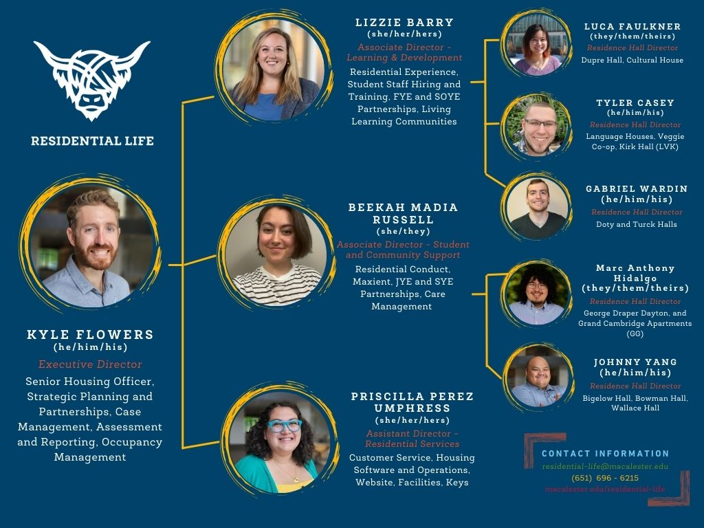 Staffing includes five professional, masters’ degree level Residence Hall Directors (RHD), Assistant Director – Residential Services, Associate Director – Student & Community Support, Associate Director – Learning & Development, and the Executive Director of Residential Life. It also includes a student staff of 35 Resident Assistants and 5 Office Assistants, and 4 Programming Assistants. The RHD team provides 24-hour on-call support to residential communities and trains, coaches, and supervises a team of undergraduate paraprofessionals (Resident Assistants) who are resources, educators, and community builders to our students. RHDs and RAs are also visible and involved members of their residential communities. All members of the staff work in collaboration with students, faculty and staff to provide opportunities, support, and a rewarding living environment to residents. Office Assistants (OA) are students who provide a welcoming environment in the building in which they’re assigned and offer administrative support to the multiple living communities. Programming Assistants (PAs) develop programming for students in the residence halls.