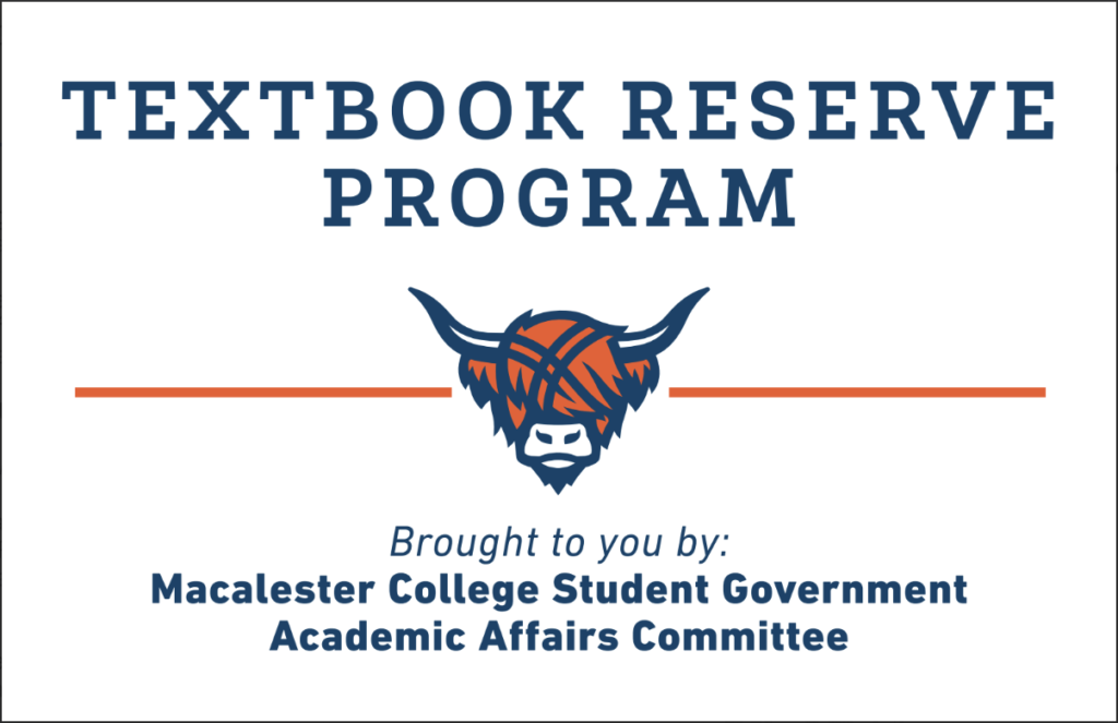 The Academic Affairs Committee of MCSG is allocated $10,000 every year for the Textbook Reserve Program. With this money, the AAC works with the DeWitt Wallace Library to purchases textbooks for Macalester students to check out of the library. The selection process focuses on expensive textbooks and frequently relied upon textbooks to ensure that all students have access to their course materials through effective and affordable ways. Please consider requesting additions using the form on this page; the AAC adds new copies to the Textbook Reserve Program at the beginning of each semester based on student, faculty, and staff requests.
