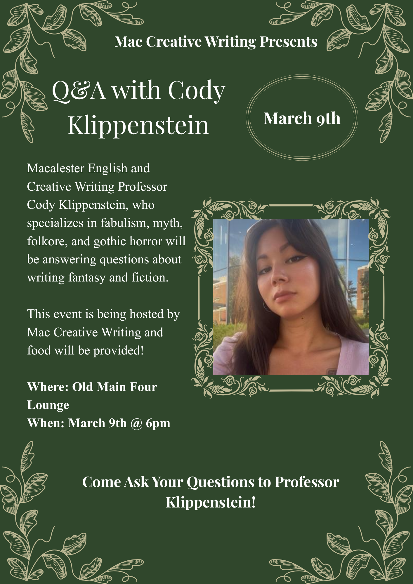 When I saw that Visiting Assistant Professor Cody Klippenstein was hosting a talk with Macalester’s Creative Writing Club on the ins and outs of writing fantasy and her debut novel, I couldn’t have been more delighted. Prof. Klippenstein was my instructor for Introduction to Creative Writing and has since become one of the friendliest faces in the department for me. Her and I often get lost on our own fantastical tangents discussing craft, and so ahead of the talk, I was greatly looking forward to hearing about her own process of craft and a bit about her new novel.