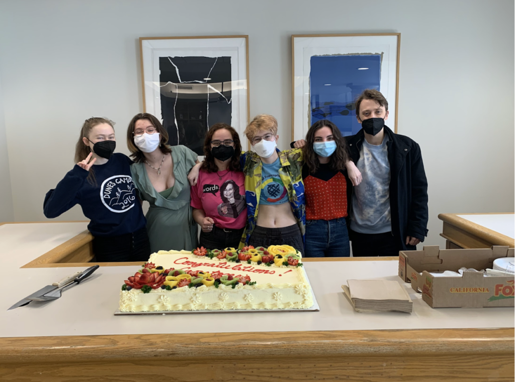 Student workers at Spring 2022 capstone nights. Left to right: Zoe Scheuerman 24, Chloë Moore 24, Birdie Keller 25, Charley Eatchel 24, Marley Craine 25, Patrick Coy-Bjork 24